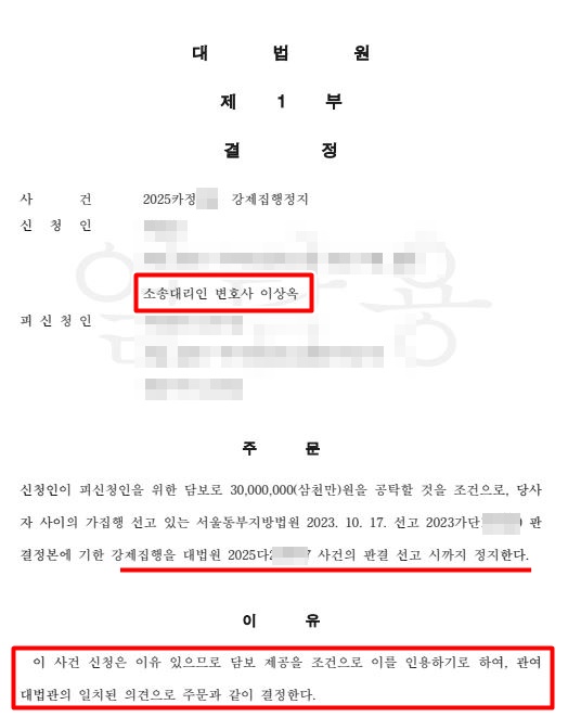 또한, 집행관이 집행을 강행하려는 의지를 내비치고 있었음에도, 일부 대법관에 대한 임명절차 지연으로 강제집행정지 결정이 빨리 나오지 않았던 상황에서, 절차의 조속한 진행을 요청하는 의견서를 다수 제출하는 등으로 사건관리에 만전을 기하였습니다.