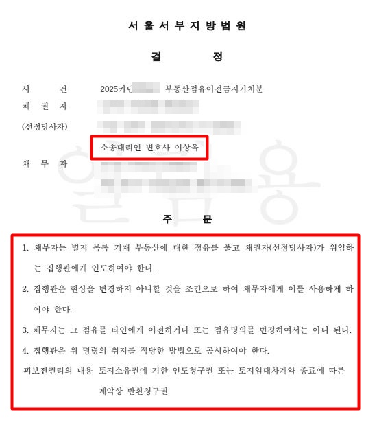 법원은 위 주장들을 모두 받아들여, 채무자의 손해를 담보하기 위해 제공하는 공탁금에 대해서는 지급보증위탁계약을 체결한 문서로 갈음할 것을 허가하여 주었고, 점유이전금지가처분 신청을 인용하였습니다.
