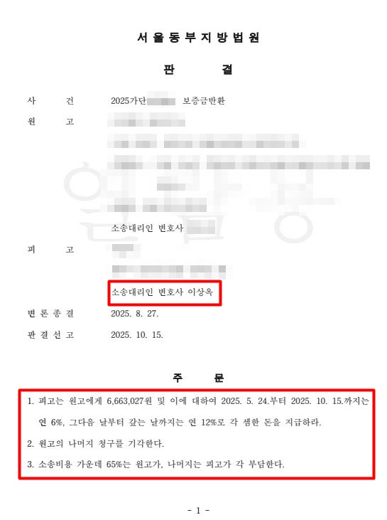 법원은 저희가 주장한 차임 인상분과 지연손해금 일부를 인정하여 공제 금액을 재산정했습니다. 그 결과, 소송 진행 중 저희 의뢰인이 변제한 금액을 제외하고 피고(임대인)는 원고(임차인)에게 6,663,027원만 추가로 지급하라는 판결을 내렸습니다. 원고의 최초 청구액 2억 3,700만 원 중 약 97%를 성공적으로 방어한 것입니다. 의뢰인은 임대차보증금 공제 항목과 액수가 잘못 산출되는 바람에 경제적 손실이 발생할 위험에 있었지만, 저희 법률사무소 명건의 조력으로 위 손실을 막을 수 있었고, 임차인의 부당한 요구에 맞서 정당한 권리를 지켜낼 수 있었습니다.