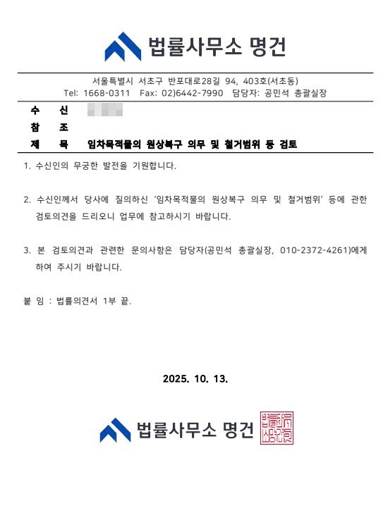 문제는 계약 체결 당시 임대인이 '최초 입주 당시'의 상태에 대한 도면이나 사진 등 객관적인 자료를 제시하거나 구체적인 내용을 설명한 바가 전혀 없었다는 점입니다. 이에 의뢰인은 부당한 요구에 대응하고 보증금을 안전하게 지킬 방법을 찾기 위해 법률사무소 명건에 자문을 의뢰하였습니다.