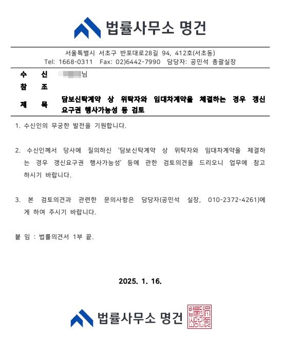 의뢰인은 상가건물 임차를 예정한 예비 임차인으로서 상가건물이 담보신탁계약에 의하여 신탁된 물건인 경우 상가임대차법상 10년간의 갱신요구권을 행사할 수 있는지, 상가건물이 공매로 처분될 경우 임대차계약이 해지될 위험이 있는지, 임대차보증금 반환의 담보를 위해 약정할 특약사항이 있는지 등을 질의하셨습니다.