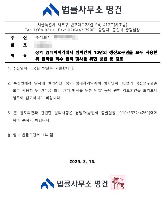 의뢰인은 임대차계약 체결 후 자동차 정비시설 및 카센터를 운영하는 임차인으로서 상가임대차법상 10년의 갱신요구권을 모두 사용한 후 임대차계약이 종료되면 건물을 인도하기로 한다는 제소전화해가 성립되어 있는 상태였습니다. 의뢰인은 이와 같은 내용의 제소전화해가 성립되어 있는 상태에서, 권리금 회수가 가능한지, 나아가 그 권리를 행사하는 방법에 관하여 질의하셨습니다.
